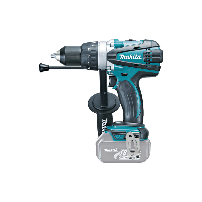 Taladro combinado MAKITA de 18 V y 2,3 Kg de peso. Con posición de atornillado, taladrado en madera o metal y taladrado en obra. Se suministra en caja de cartón sin baterías, sin cargador y sin maletín.